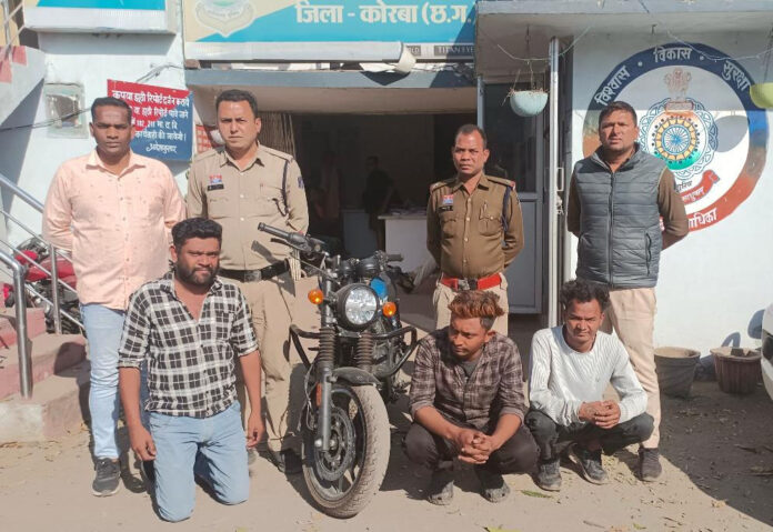 कोरबा 09 फरवरी। कोरबा जिले में संपत्ति संबंधी अपराधों पर प्रभावी नियंत्रण के लिए पुलिस लगातार सख्त कार्रवाई कर रही है। इसी कड़ी में थाना कोतवाली कोरबा पुलिस ने मोटरसाइकिल चोरी के एक मामले का खुलासा करते हुए तीन आरोपियों को गिरफ्तार किया है। आरोपियों के कब्जे से चोरी की गई मोटरसाइकिल भी बरामद कर ली गई है।