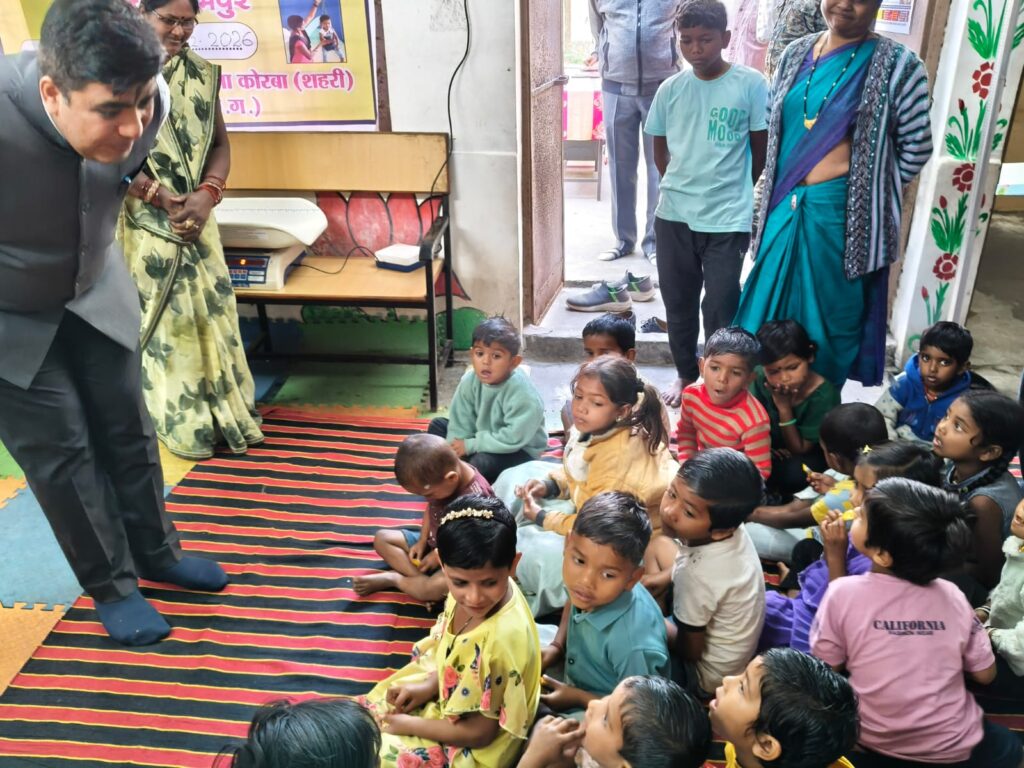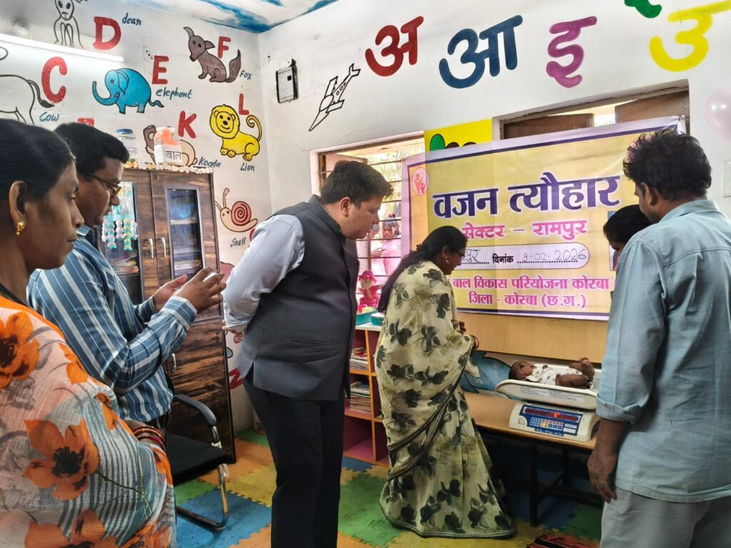 कोरबा, 09 फरवरी 2026/ शासन के निर्देशानुसार वजन त्यौहार 2026 का शुभारंभ आज आंगनबाड़ी केन्द्र रामपुर-1, सेक्टर रामपुर, कोरबा (शहरी) में कलेक्टर श्री कुणाल दुदावत द्वारा किया गया। कार्यक्रम में जिला कार्यक्रम अधिकारी श्री बसंत मिंज, वार्ड पार्षद श्रीमती ममता यादव तथा परियोजना अधिकारी श्री मनोज अग्रवाल उपस्थित रहे।