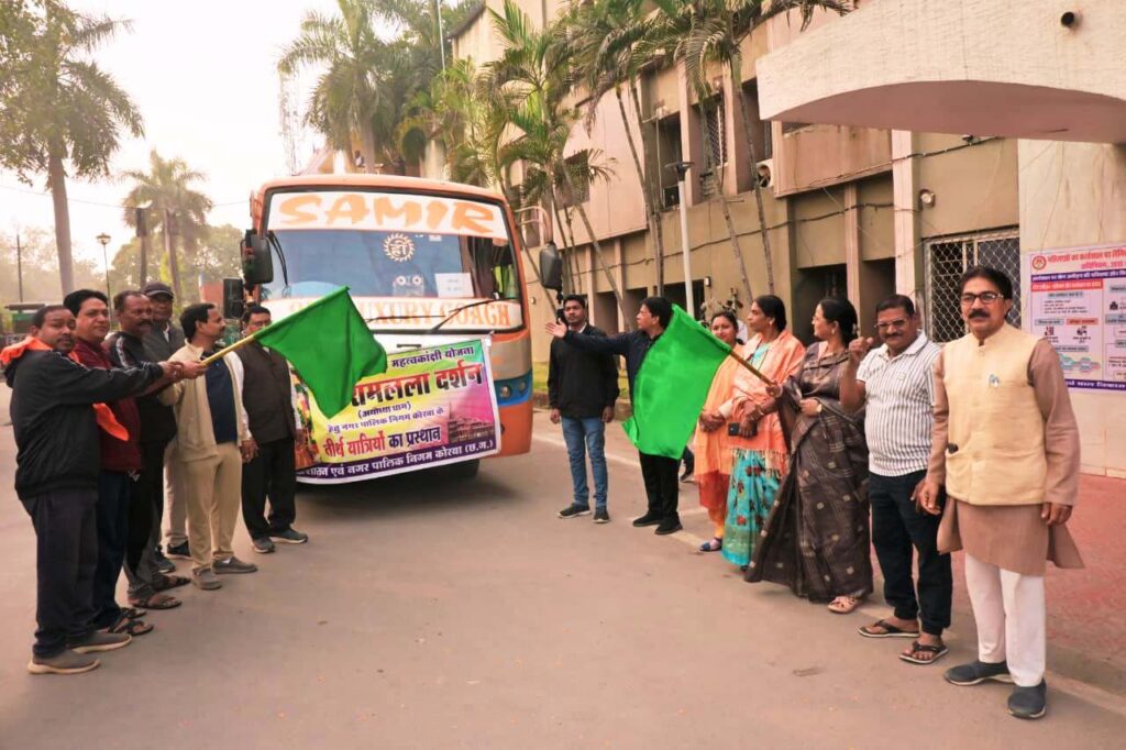 कोरबा 04 फरवरी 2026 -महापौर श्रीमती संजूदेवी राजपूत ने पार्षदगणों की उपस्थिति में आज श्रीरामलला दर्शन योजना के तहत 35 तीर्थयात्रियों के दल को पवित्र अयोध्याधाम के लिए निगम कार्यालय साकेत भवन से रवाना किया। उन्होने तीर्थयात्री बस को हरी झण्डी दिखाई एवं तीर्थयात्रियों को तिलक लगाकर व पुष्पमाला पहनाकर उन्हें अपनी शुभकामना व बधाईयाॅं दी। इस अवसर पर मेयर इन काउंसिल सदस्य हितानंद अग्रवाल, अजय गोंड़, ममता यादव, पार्षद रामकुमार साहू, युगल किशोर कैवत्र्य, अपर आयुक्त विनय मिश्रा, निगम सचिव रामेश्वर सिंह कंवर, प्रकाश अग्रवाल, अरविंद सिंह, शंकर साहू, संजय भास्कर, संतोष यादव, छन्नू सिंह आदि के साथ अन्य लोग उपस्थित थे।